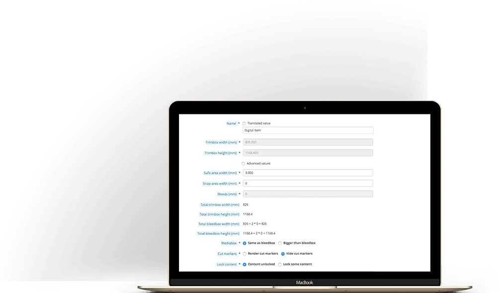 Tailor production and print specifications to your needs. Define your product’s printing area, bleeds, media sizes and other parameters. Get high quality output files of your choice: .pdf, .jpg, or .png ready for printing.